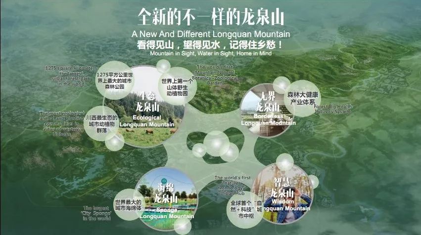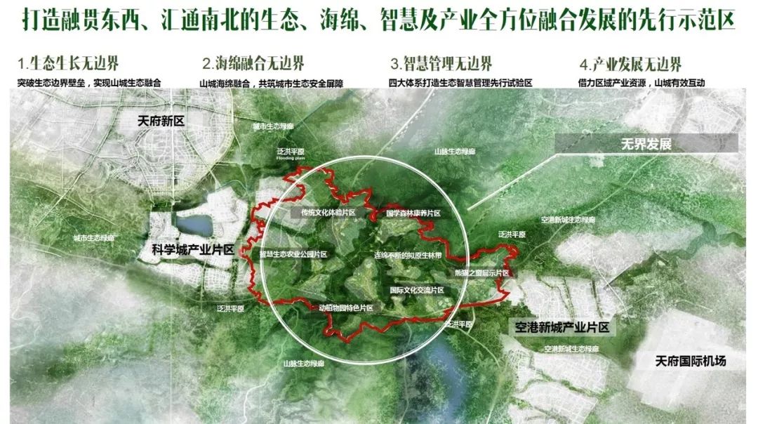 这是成都天府新区和空港新城之间的山体区域,是成都“一山”连“两翼”山、城、人互动融合的最佳示范区,规划将以生态、海绵、智慧、产业四大战略落位为基础,在大森林体系中植入六大特色产业片区,示范”无界发展“的城市新理念。