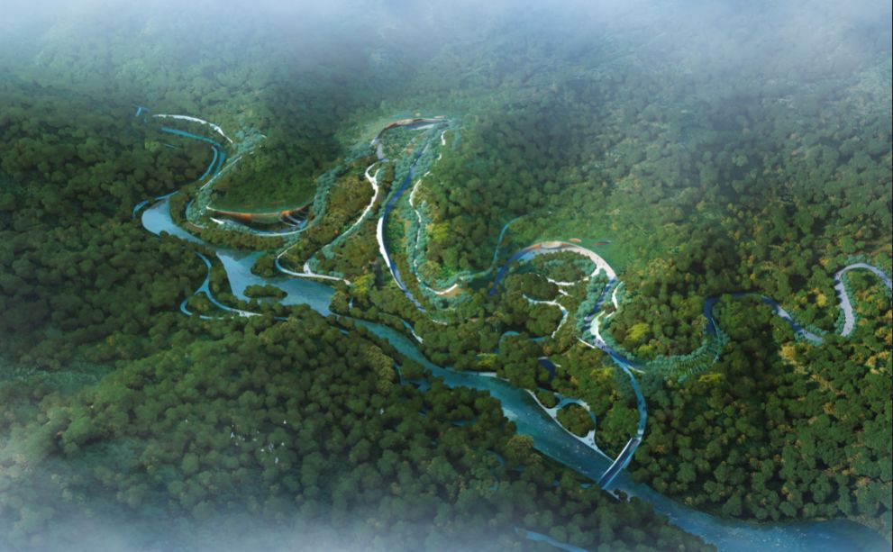 丹景谷建筑以桥为创意,蜿蜒于山谷森林,顺地形高低起伏,时而为建筑,时而为平台,时而为路,搭建起世界文化交流的友谊之桥,可平台远眺美景,也可开展文化交流体验,融于森林的户外开放空间将成为时尚展演和品牌发布的最佳场所。